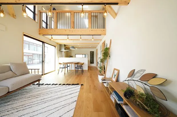 リビングは吹き抜け仕様。 上下に視線が抜けることで、建物面積以上の広がりを感じられます。