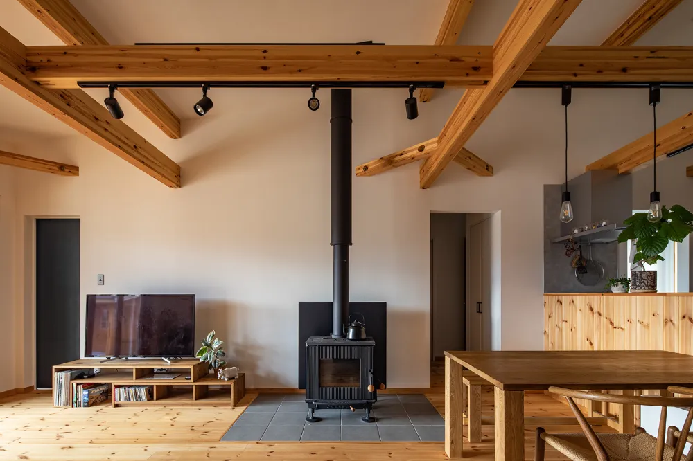 見上げたくなる勾配天井と、薪ストーブのある暮らし。 暮らしの豊かさを感じる、規格住宅です。
