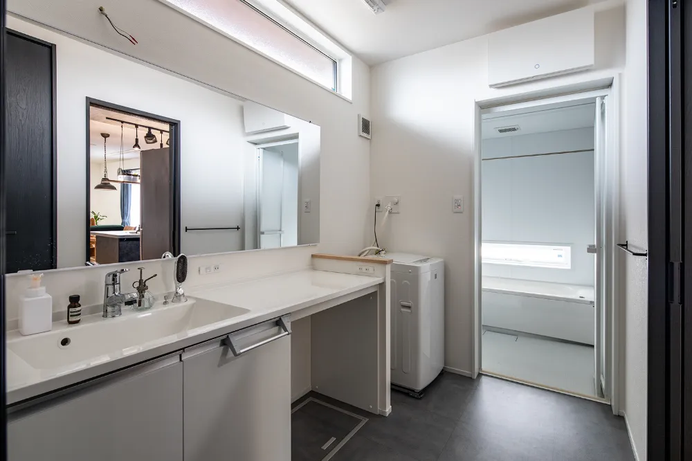 横並びで使える、ゆとりあるワイド洗面台。 ホワイトの扉柄が、清潔感と明るさをプラスします。