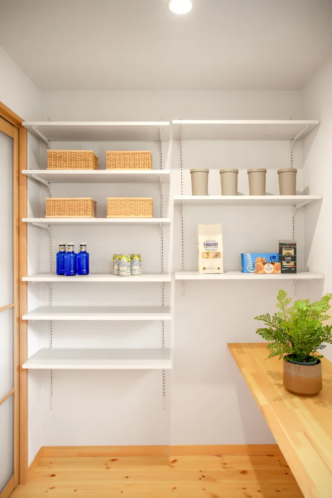 食品や日用品をたっぷりしまえる、2帖のゆったりパントリー。 可動棚だから、収納するものに合わせて自在に調整できます。