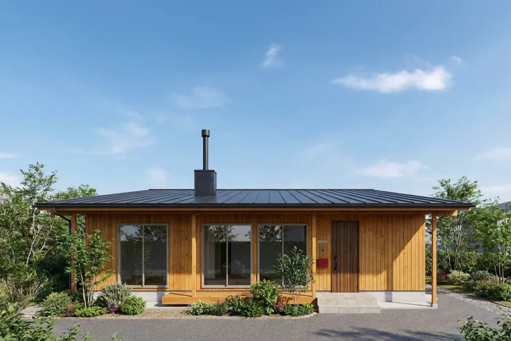 木の外壁がやさしく映える、平屋ならではの落ち着いた佇まい。 薪ストーブの煙突が、暮らしのぬくもりを感じさせるアクセントに。