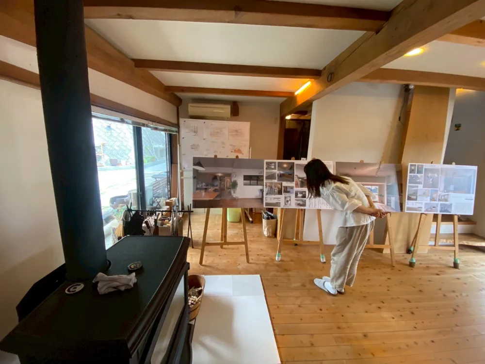 ※旧納屋スペースを改装した打合せスペースで施工事例パネルを展示
