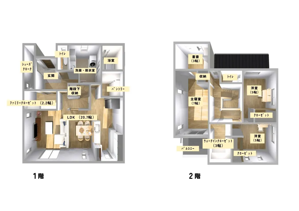 洗濯物をすぐに収納できる1階のファミリークローゼットや、キッチン横のパントリーで家事を最適化。