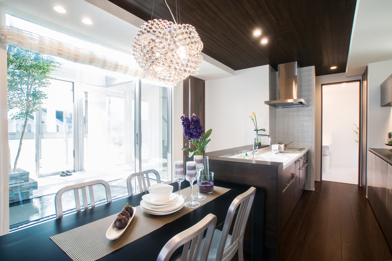 中庭を囲むようにレイアウトされた、2F子世帯のLDK。室内か陽の移ろいを感じられる癒しの空間で、食事やリラックスタイムをゆったりと過ごしていただけます。